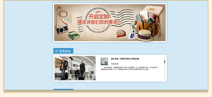 Project Description 百悦逸游于2012年初由二位资深的旅行家创办,是成都传媒集团旗下成都新闻国际旅行社有限公司的高端旅游品牌,总部位于成都高新区天府大道中段美年广场。在百悦逸游成立之前,创始团队亲自到全球三十多个国家实地考察,带着第一手的资讯和执着的信念创立了中国西部第一家真正意义上的私人定制旅行机构。百悦的旅行不是跟团挤大巴,不是十天去十个国家,更不是没完没了的... Official website address 辽阳http://www.100.travel I want to share